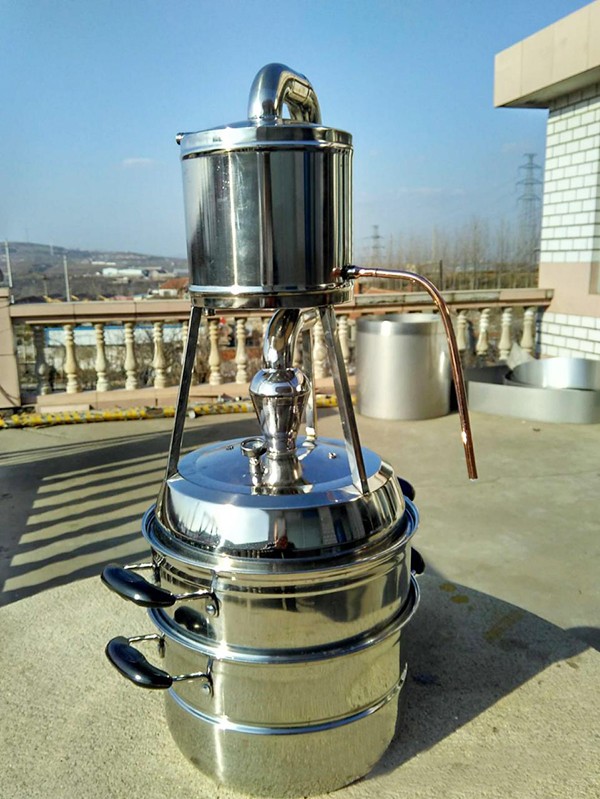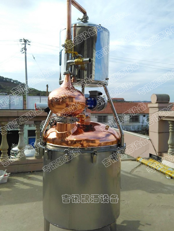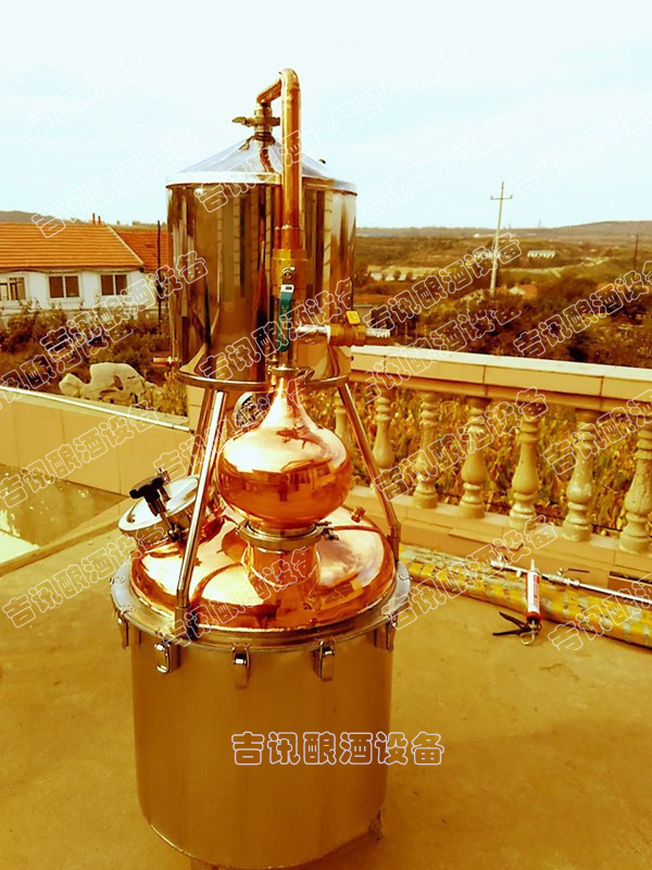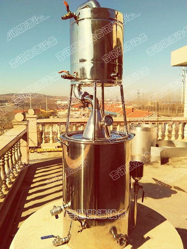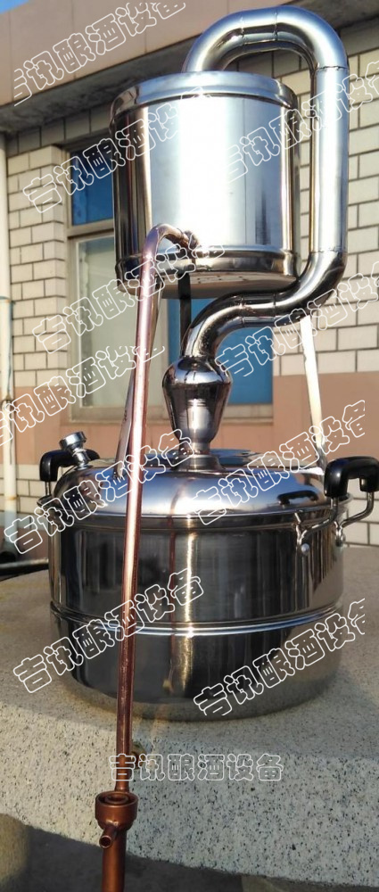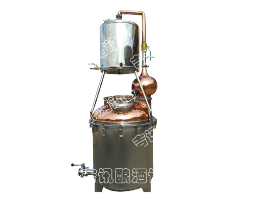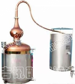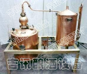 本機屬單次蒸餾機組,采用夏朗德蒸餾器與糧食酒蒸鍋部分優勢特色,酒汽聚集在上方的球形回流器中,產生少量回流提餾,經由延長拔高蒸汽導管或天鵝之頸,使雜質下沉與提餾,然后酒氣進入冷卻器,在冷卻器中冷凝出粗酒,原酒三四十度左右。把一次 出的原酒重新加入蒸餾器進行二次蒸餾,得到所需原酒,一般酒度為遞減過程。或者采取“切酒”方式取酒,蒸餾時的蒸汽,酒精濃度高,稱為“酒頭”,要和其他的分離,隨后獲得的是“酒心”,它是清澈透明的烈酒,取其酒心,然后低度酒混入發酵液或收集做二次蒸餾。
